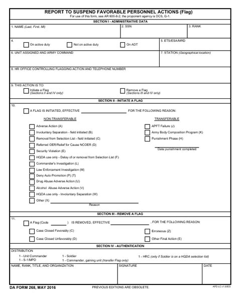 We would like to show you a description here but the site won’t allow us. A flag is the temporary suspension of favorable personnel actions such as promotions or special duty assignments. Da form 268, jun 87 edition of 1 jan 80 is obsolete. Examples can be contributed by using the form below.